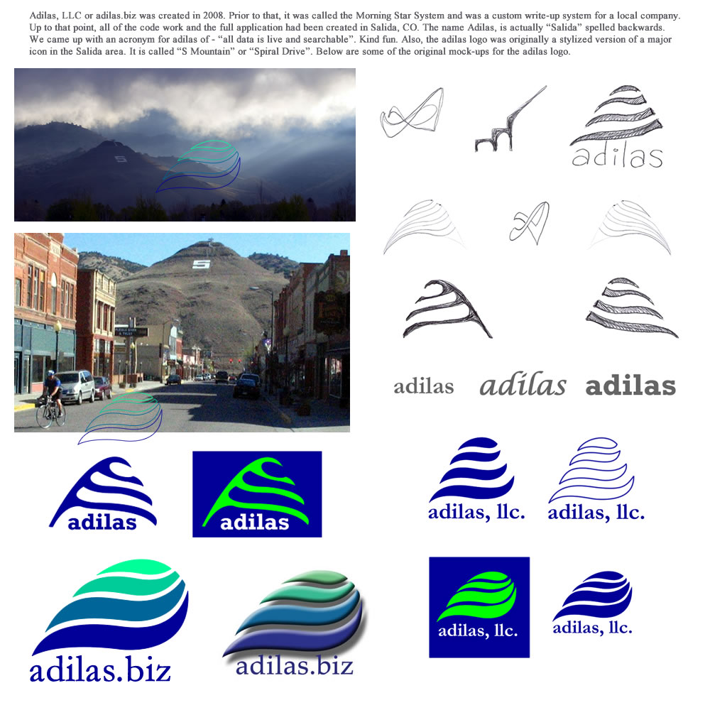 Working on a fun historical entry for the adilas logo. I was working on this earlier today before the demo with a client and finished it up during this small window. It has a number of older pictures and drawings of the adilas logo and some original concept drawings. Here is the text on the top of the image. Adilas, LLC or adilas.biz was created in 2008. Prior to that, it was called the Morning Star System and was a custom write-up system for a local company. Up to that point, all of the code work and the full application had been created in Salida, CO. The name Adilas, is actually "Salida" spelled backwards. We came up with an acronym for adilas of - "all data is live and searchable". Kind fun. Also, the adilas logo was originally a stylized version of a major icon in the Salida area. It is called "S Mountain" or "Spiral Drive". |