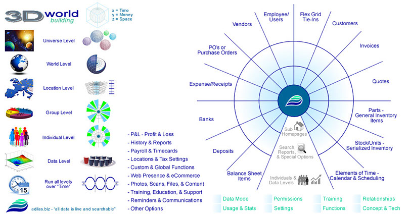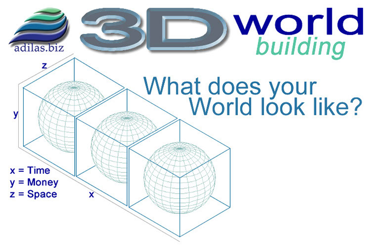 3-D world building concepts. We at adilas.biz are actively trying to teach and educate our users in how things work and play together to make a whole system. The three main dimensions or 3D levels are: x = Time, y = Money, z = Space.