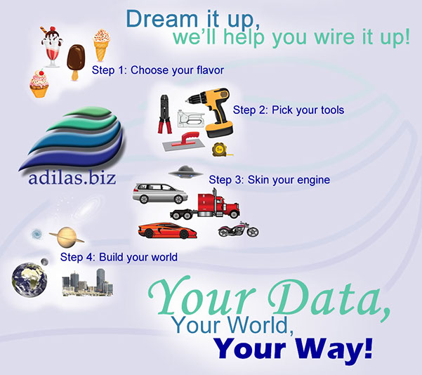 Helping customers build their own business worlds. Step 1: Choose your flavor. Step 2: Pick your tools. Step 3: Skin your engine. Step 4: Build your world. Adilas - all data is live and searchable.