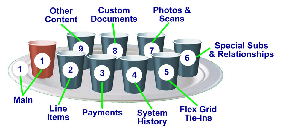 Adilas stores your data in different containers. Our main player groups are: customers, invoices, quotes, vendors, PO's, general inventory items, serialized inventory, deposits, expense/receipts, employee/users, balance sheet items, elements of time (calendar & scheduling).